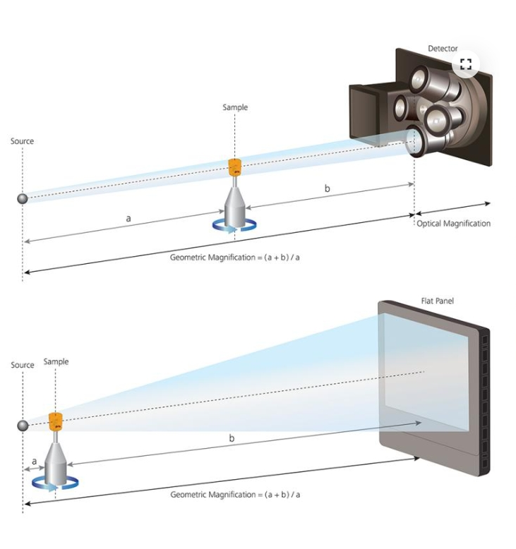 与传统microCT相同,图像首先通过几何投影放大,随后投射到闪烁体上,将X射线转换为可见光图像,然后通过显微镜光学元件进行光学放大,最后由CCD探测器采集图像。